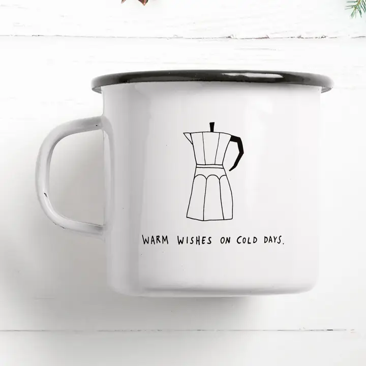 Ein Becher für kalte Tage und warme Gedanken. Mit der Illustration einer klassischen Espressokanne und dem Spruch „Warm wishes on cold days“ wird jeder Kaffee- oder Teemoment zu einer kleinen Auszeit. Leicht, robust und zeitlos schön – der Emaillebecher begleitet dich durch den Winter, auf Reisen oder ins Büro. Illustriert in Münster, von Hand bedruckt und in kleiner Auflage gefertigt – ein charmantes Geschenk für alle, die Wärme lieber im Herzen als in der Heizung suchen.